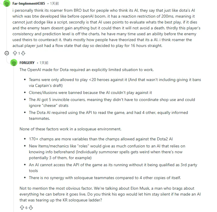 我个人认为是BRO战队的Roamer,但对于那些觉得是AI的人来说,他们的理由是这就像Dota的AI(顺便说一句,那是在OpenAI爆发之前开发的)。它有200毫秒的反应限制,意味着它不能像脚本那样瞬间躲避。其次,AI使用积分来评估最佳操作,如果它死了且敌方没有任何收益但它能赚,那它就不会为了保命而放弃收益。第三,这个玩家的稳定性和预判水平高得离谱,他很多次在敌人出招反制之前就已经放了技能。这就是人们推测它是AI的主要原因。我觉得Roamer本人那天可能只是进入了“心流”状态,所以决定一口气连打16个小时。