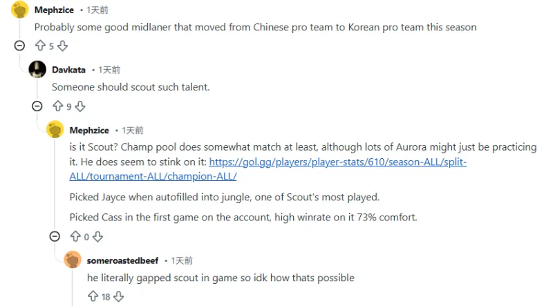 是Scout吗?英雄池确实有点像,虽然玩了很多把Aurora可能只是在练英雄。我看数据他好像玩这个英雄玩得挺烂的。补位打野的时候选了杰斯,这是Scout玩得最多的英雄之一。这就这个号第一把就选了蛇女,这也是他的绝活,胜率高达73%。