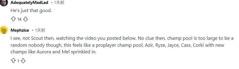 懂了,看了你下面发的视频,那就不是Scout了。那我就没头绪了,不过这英雄池深得不可能是个路人无名之辈。感觉这绝对是职业选手的英雄池:沙皇、瑞兹、杰斯、蛇女、飞机,中间还穿插着阿萝拉和梅尔这种新出的英雄。