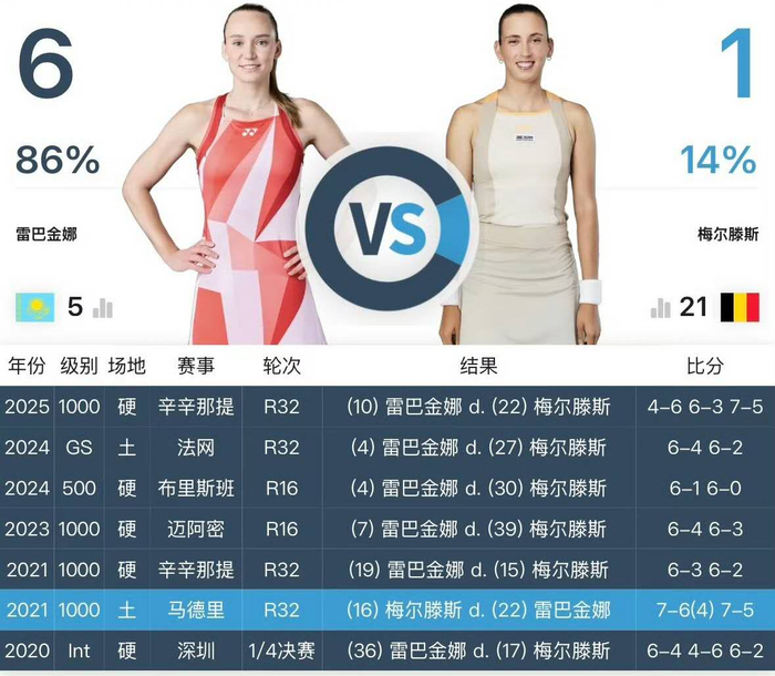 从交手记录来看:双方此前有过7次交锋,莱巴金娜以6胜1负占据绝对优势。最近一次是在2025年辛辛那提站,莱巴金娜经过三盘激战以2-1获胜。
